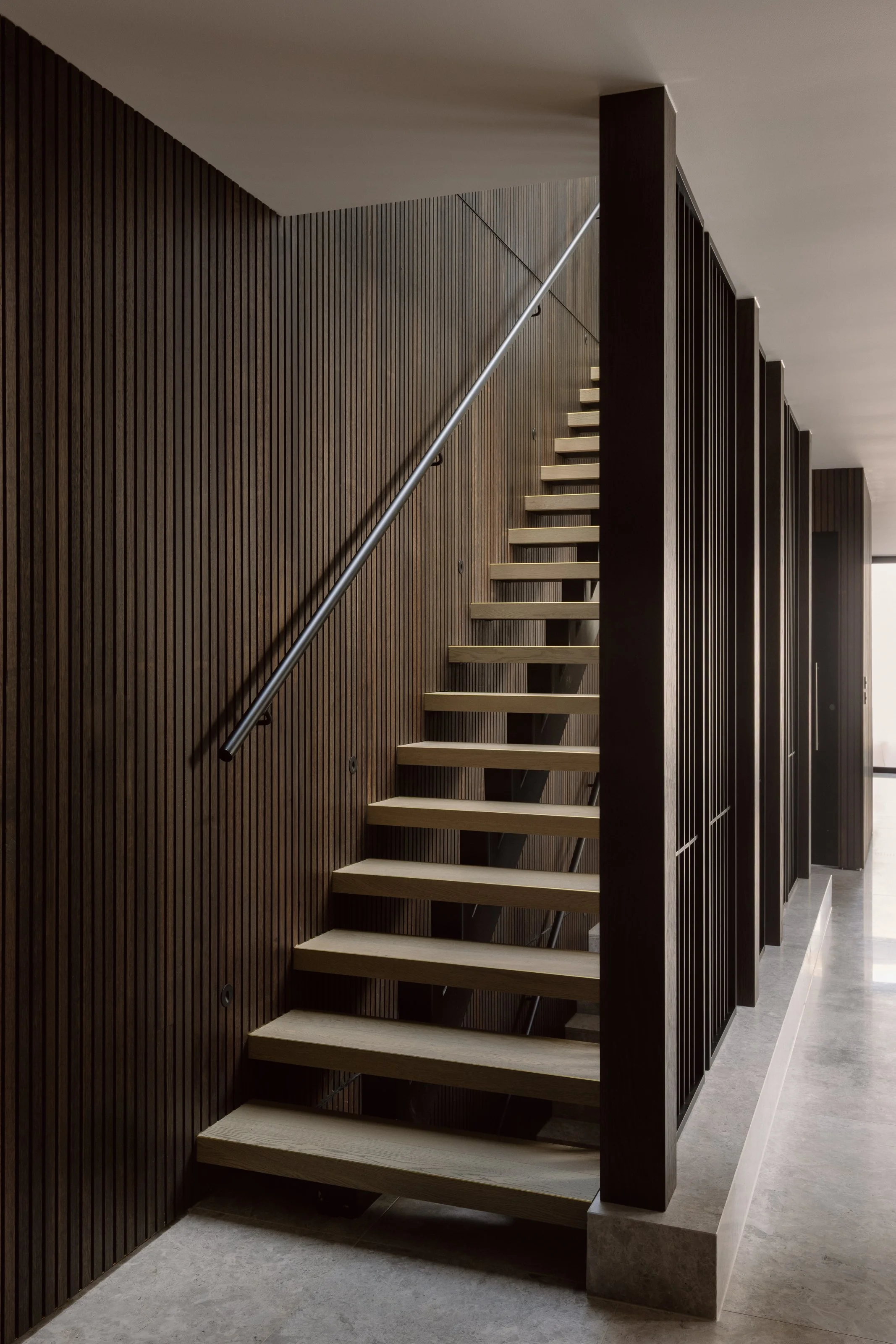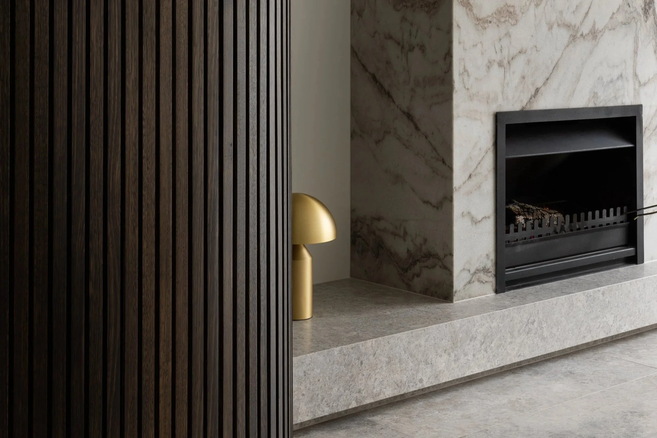 The living areas are defined by thoughtful detail. A sculptural marble fireplace provides a bold centrepiece, balanced by the warmth of curved timber panelling. An open floating staircase reinforces flow and openness, guiding the eye upward with lightness and precision.